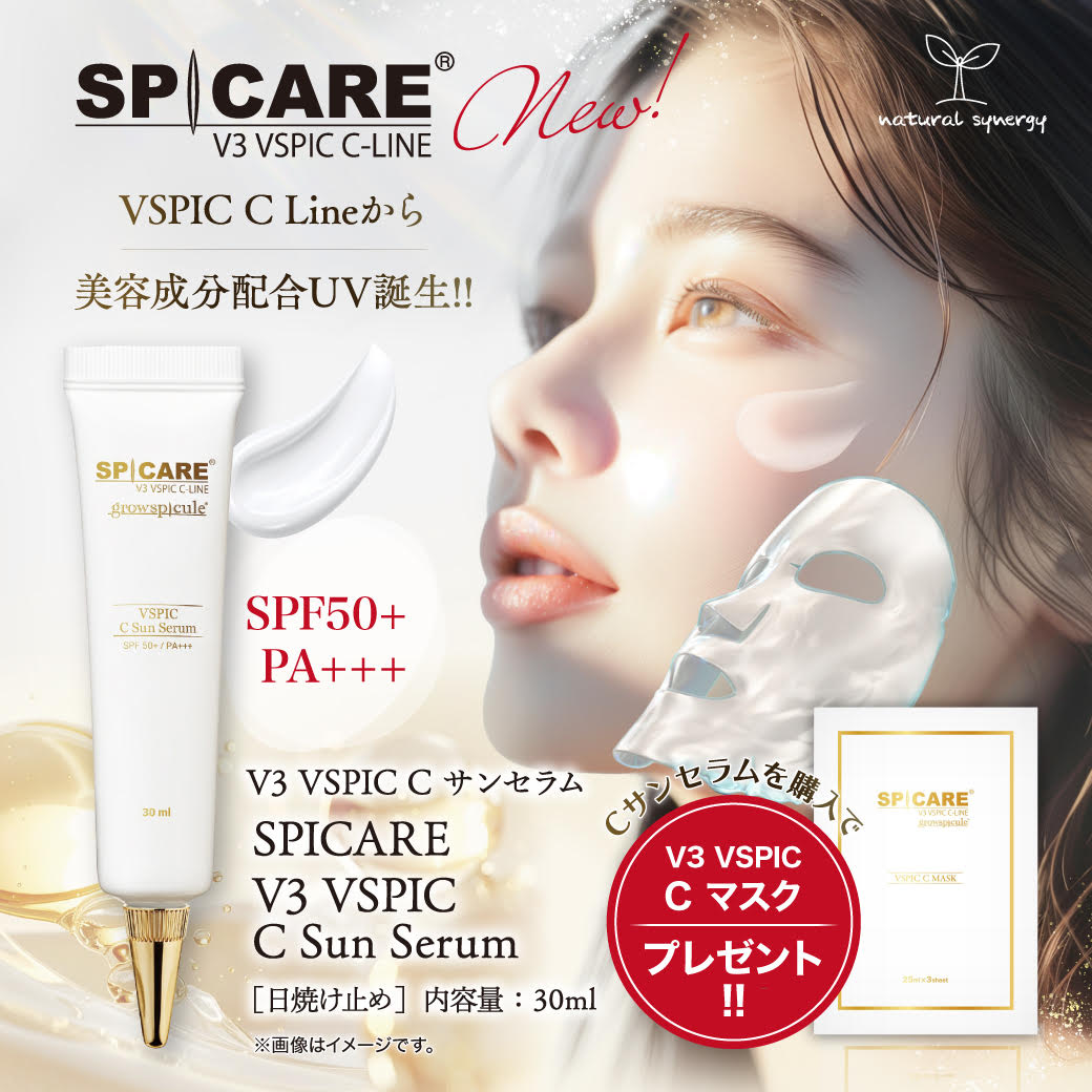 SPICAREのC LINEからビタミンC※1を含有した独自成分グロウスピキュール※2とペプチドコンプレックス※3、植物由来成分※4の配合により紫外線対策に敏感な女性をターゲットとしたSun Serum。