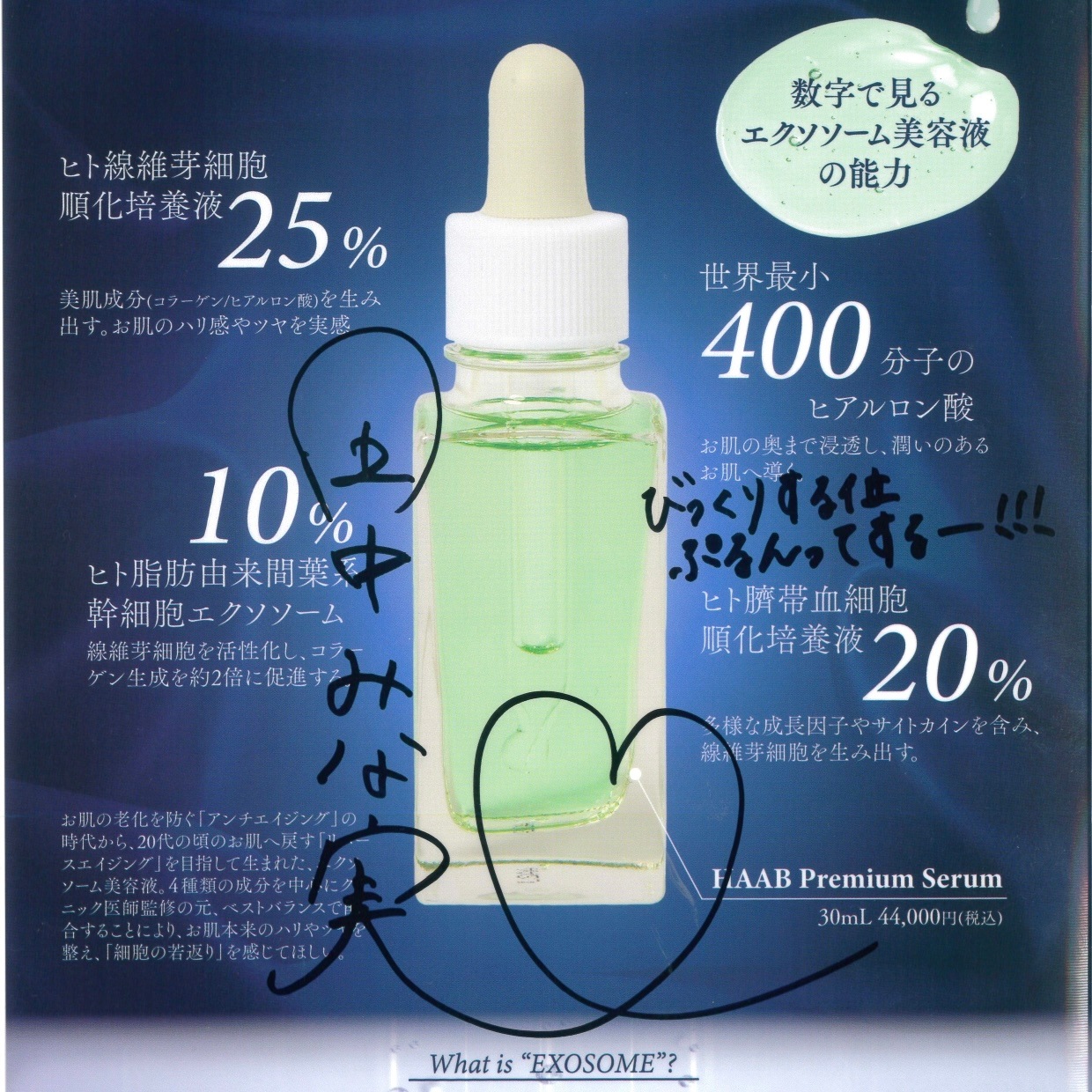 ヒト幹細胞培養液、ヒト線維芽細胞培養液、エクソソーム培養液、最小400分子ヒアルロン酸をクリニック医師監修の元、ベストバランスで配合した最先端再生美容液。